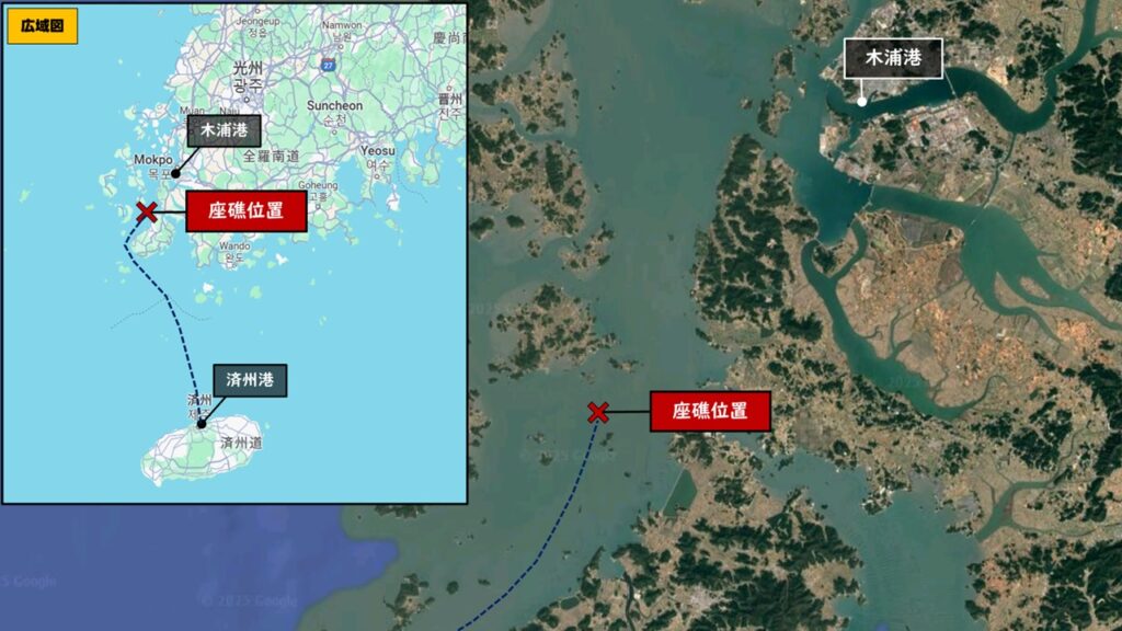 フェリー「QUEEN JENUVIA II」が座礁した周辺海域をGoogleマップで見てみると、大小いくつかの島々が点在している。さらに事故海域は沿岸旅客船の航路が密集する狭い水路となっており、韓国海洋警察はフェリーの変針が遅れたことで事故が起きたとみている。