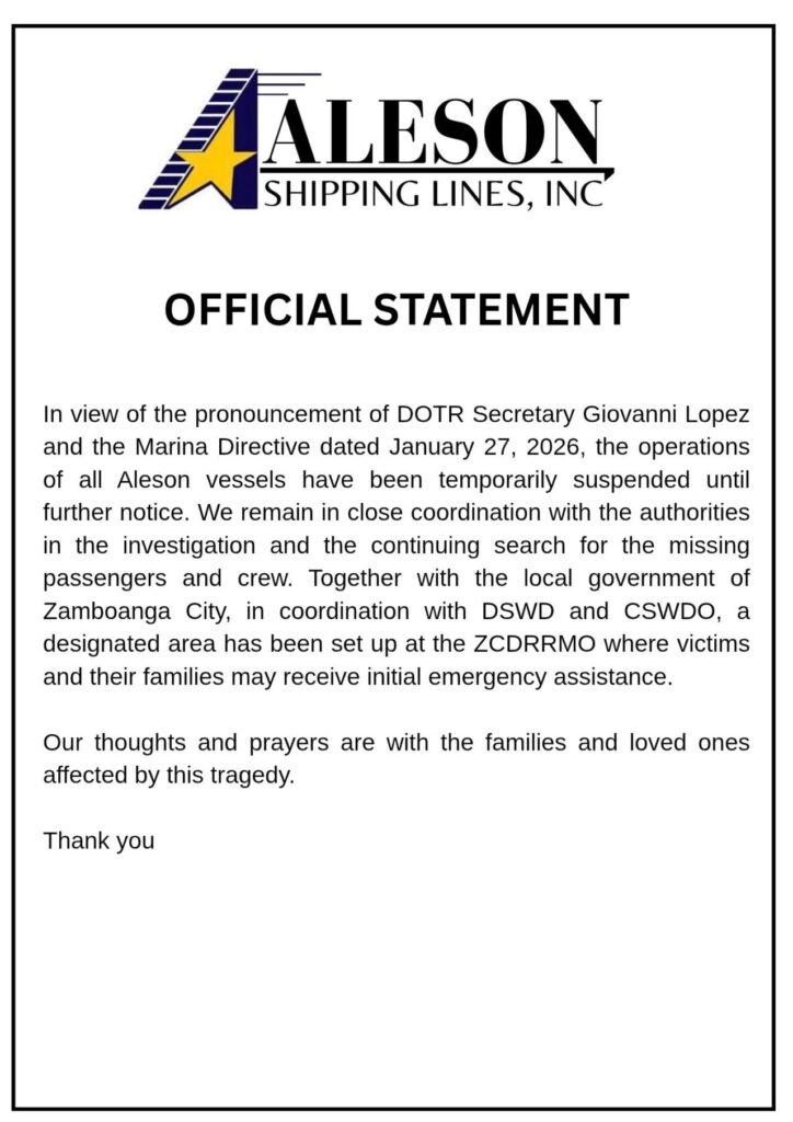 運輸省ジョバンニ・ロペス長官の発表および2026年1月27日付のマリーナ指令に基づき、アレソンの全船舶の運航は追って通知があるまで一時停止となります。当社は当局と緊密に連携し、行方不明の乗客・乗組員の捜索と捜査を継続しています。サンボアンガ市当局、DSWD(フィリピン社会福祉開発省)、CSWDO(市社会福祉開発事務所)と連携し、ZCDRRMO(サンボアンガ市防災管理局)に指定区域を設け、被害者とそのご家族が初期緊急支援を受けられるよう配慮しています。