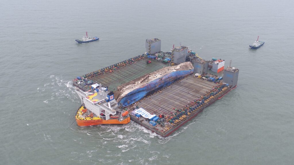 関連 ジブラルタル沖の貨物船「OS 35」半潜水式バージへの搭載完了