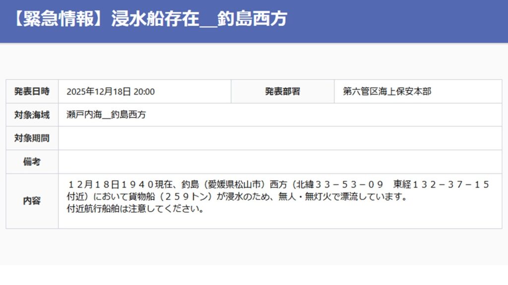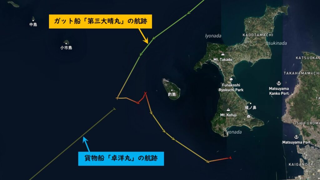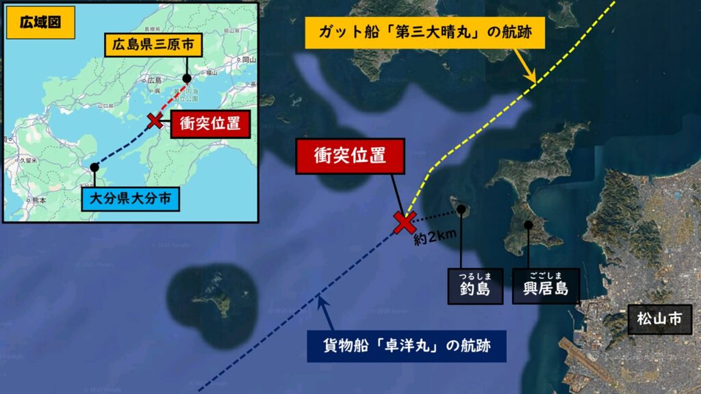 2025年12月18日19時ごろ、愛媛県松山市沖の釣島から西へ約2kmの海上で貨物船「卓洋丸」(TAKUYO MARU)とガット船「第三大晴丸」(TAISEI MARU NO. 3)の衝突事故が発生。