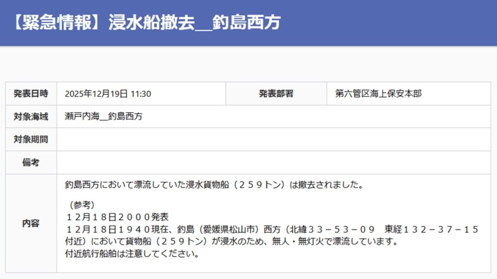 第六管区海上保安本部は、事故発生からおよそ1時間後の12月18日20時に緊急情報を発表。貨物船「卓洋丸」が浸水し、無人・無灯火で漂流していることを発表し、付近を航行する船舶へ注意喚起をおこなっています。