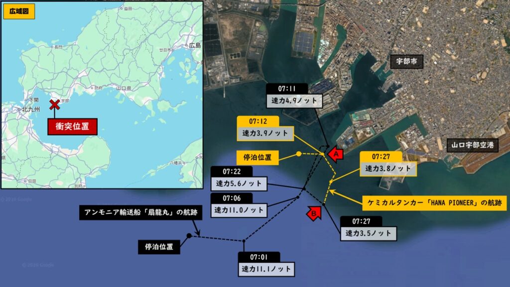 2026年2月1日、山口県宇部市の宇部港内で韓国船籍のケミカルタンカー「HANA PIONEER」とアンモニア輸送船「扇龍丸」の衝突事故が発生。