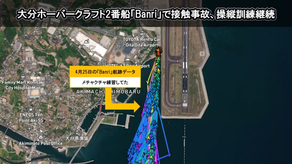 事故が起きた4月25日の「Banri」航跡データを見ると、大分空港への出入りを繰り返し訓練していることが確認できました。