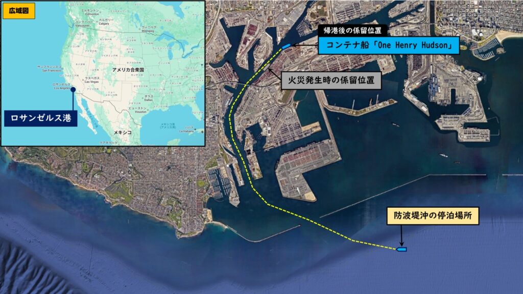 コンテナ船「One Henry Hudson」のAIS情報によると、防波堤沖の停泊場所から移動が始まったのは11月26日22時ごろ(現地時間)。23時ごろ、ヴィンセント・トーマス橋を通過。火災発生時に係留していた場所から北東へ約900mの位置へ到着したのは、日付が変わった27日04時ごろ。