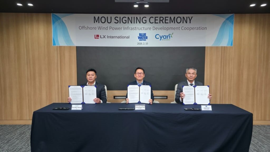 2026年2月23日、シンガポールに拠点を置くCyan Renewables、デンマークのBlue Water Shipping、韓国に本社を置くグローバル商社のLX Internationalは、韓国における洋上風力向けマーシャリング港湾の開発で協力するための覚書(MoU)締結を発表しました。