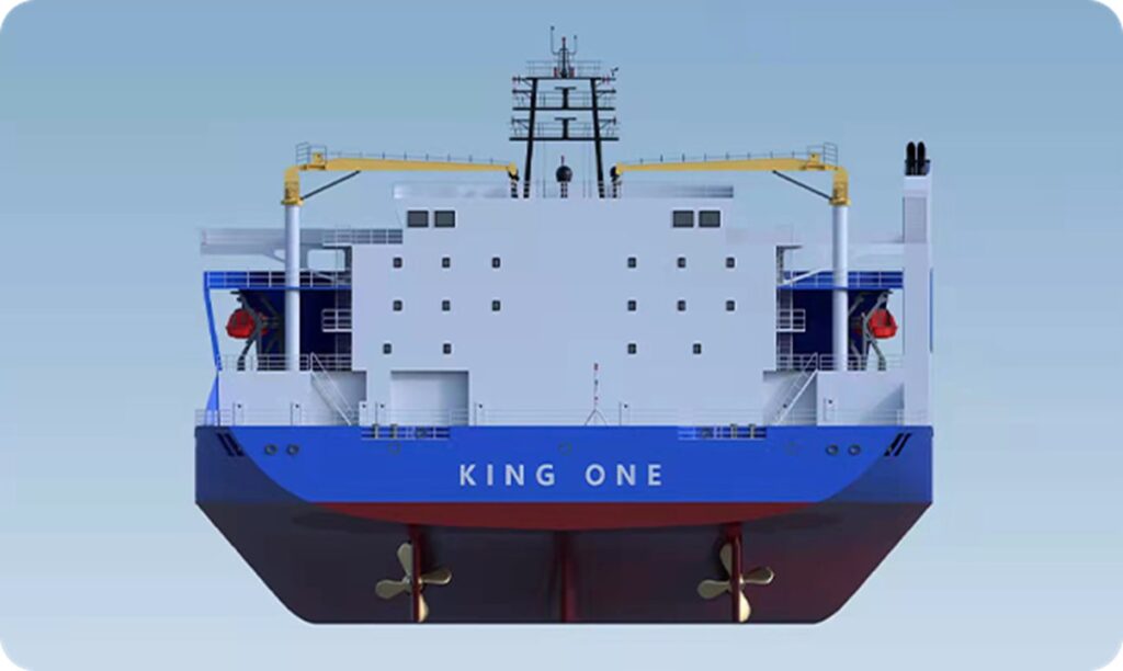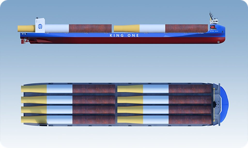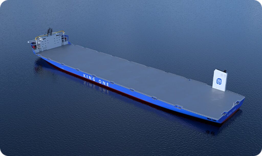 洋上風力、石油、ガス分野の大型機器輸送用に設計・開発されたという大型甲板輸送船「KING ONE」は長さ240m、幅51m、深さ13m。甲板面積は12,000m2で速力13ノット、航続距離16,000海里(約30,000km)。