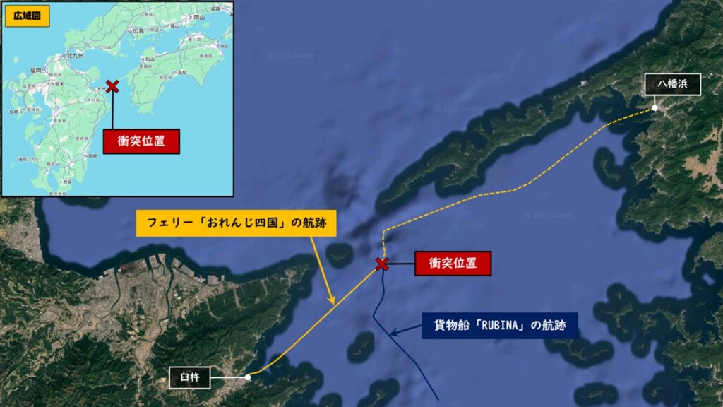 2025年11月19日18時30分ごろ、豊後水道でオレンジフェリーの「おれんじ四国」(全長119.9m)とパナマ船籍のばら積み貨物船「RUBINA」(全長229m)が衝突する事故発生。