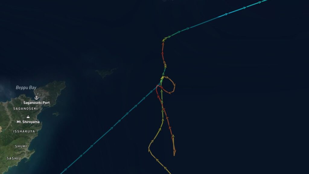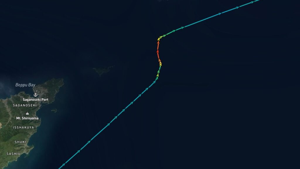 フェリー「おれんじ四国」は衝突前に針路の変更はほぼ確認できません。一方、ばら積み貨物船「RUBINA」は18時00分ごろ(衝突25分前)に右舷方向へ舵を切り北西進から北東進へ、さらに18時12分ごろ左舷方向へ舵を切って北東進から北進へと針路を変更。北進するまでは6~8ノットでしたが、北進し始めてから速力をあげているのが確認できました。