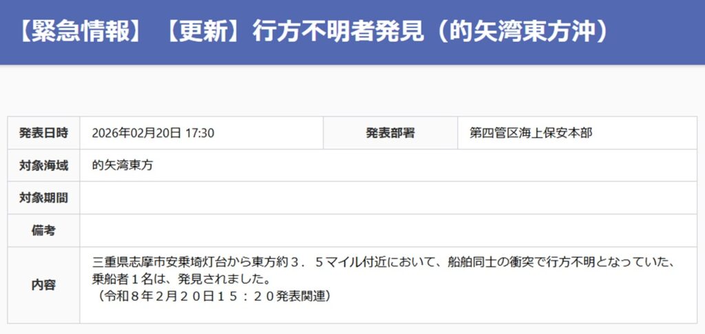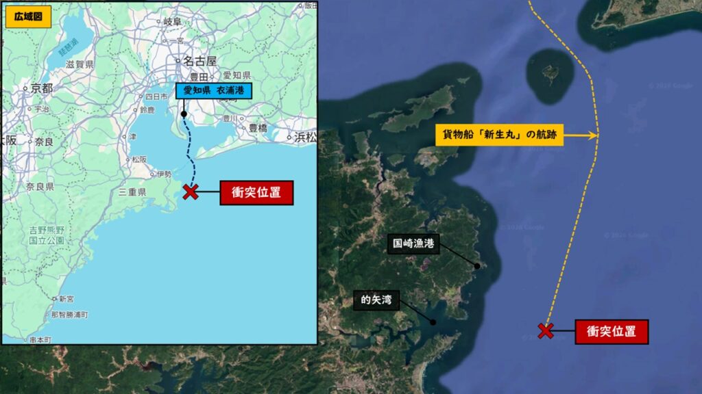 2026年2月20日13時ごろ、三重県の的矢湾沖で貨物船「新生丸」と遊漁船「功成丸」の衝突事故が発生。