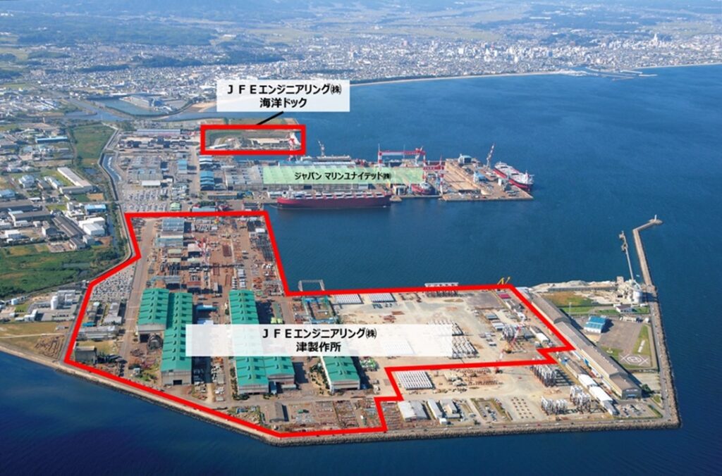 JFEエンジニアリングは、2024年3月に着床式基礎の製造拠点として笠岡モノパイル製作所を完成させており、今回の浮体式基礎製造拠点となる津製作所と合わせ、あらゆる形式の洋上風力基礎を製造できる国内唯一の企業となる。