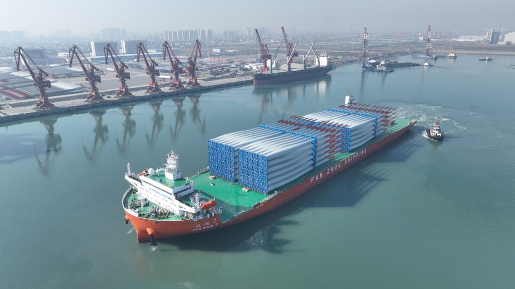 2026年1月13日、江蘇泛洲船務(Jiangsu Fanzhou Shipping)の大型甲板輸送船FAN ZHOU 7」(泛洲7)が建造後の初任務として、風力タービンブレード132枚を積載し、中国の南通市にある呂四港を出港しました。