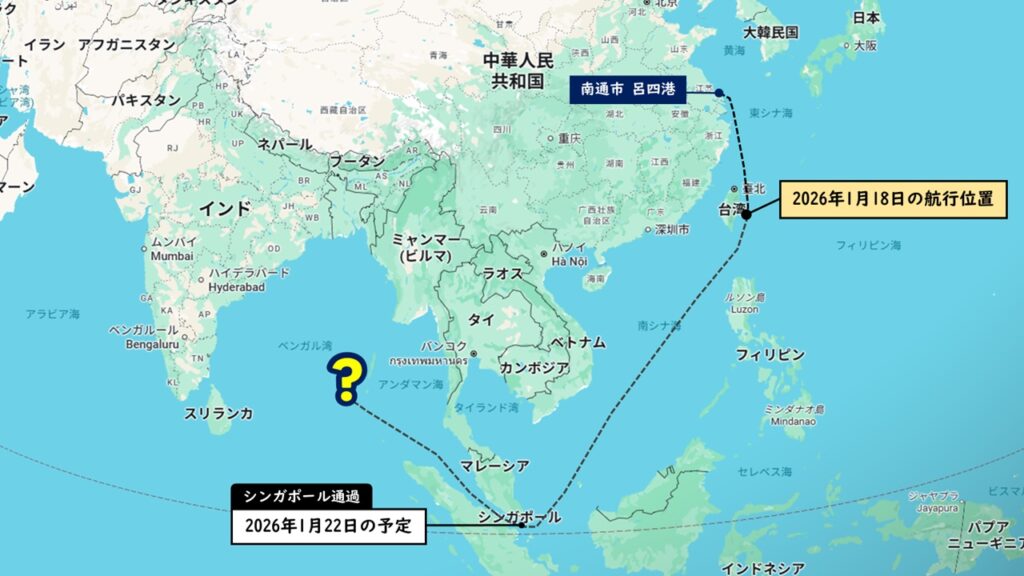大型甲板輸送船「FAN ZHOU 7」は、2026年1月13日に中国の南通市 呂四港を出港して1月18日時点で台湾東部を南進していました。AIS情報では1月22日にシンガポールを通過する予定。