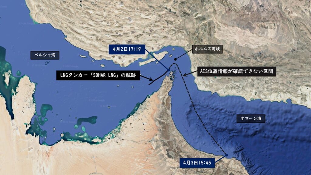 LNGタンカー「SOHAR LNG」のAIS情報を確認すると、ホルムズ海峡に近い2026年4月2日17時19分(日本時間)からAIS位置情報は途絶えており、次に確認できる位置情報は4月3日15時45分でホルムズ海峡を通過してオマーンのマスカット沖にいました。