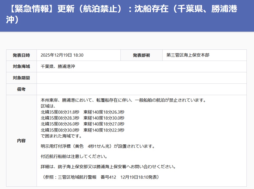 第三管区海上保安本部から2025年12月19日に緊急情報として、杭打ち船「第八くす号」が沈没している勝浦港のエリアに一般船舶の航泊禁止がアナウンスされています。