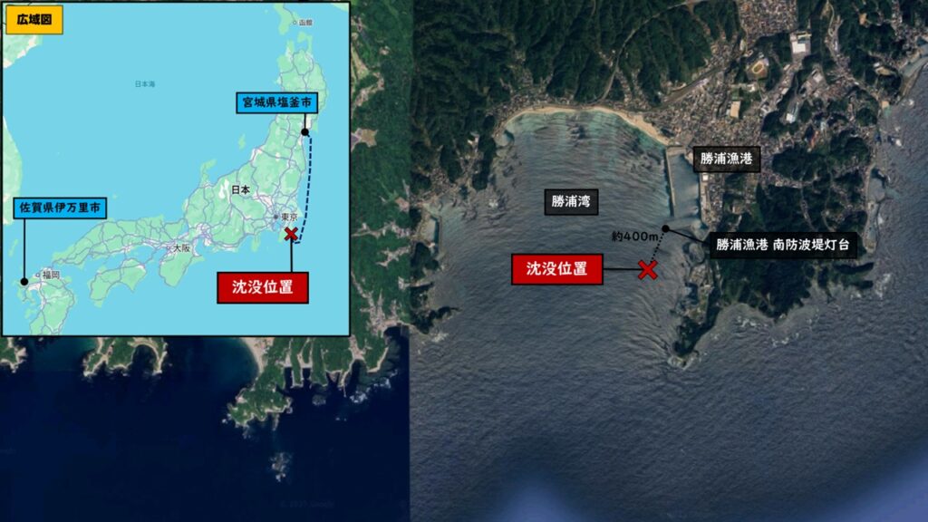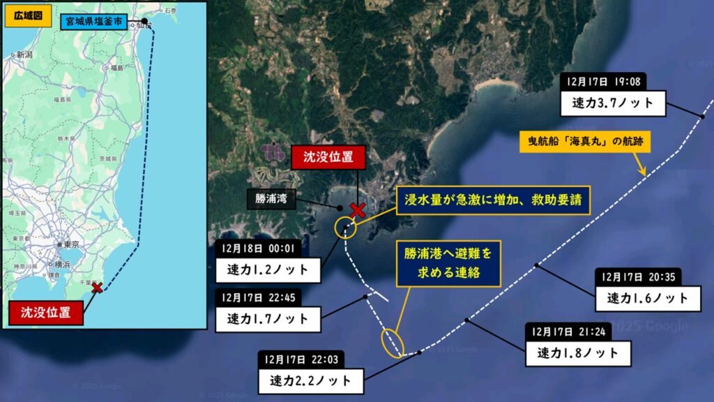 宮城県塩釜市を出港して、勝浦沖近くを航行する所までは速力5~7ノットで何事もない感じ。12月17日19時ごろから速力が落ち始めて1~2ノットへ低下。17日22時25分ごろに勝浦港へ避難を求める連絡を入れた後、1時間程度沖合で待機。待ちきれなくなったのか、連絡を受けて移動を開始したのか不明ですが、23時30分ごろから勝浦湾へ向けて航行を開始。勝浦湾内に入った18日0時ごろ、浸水量が急激に増加したため救助を要請。そして、0時50分ごろに沈没。