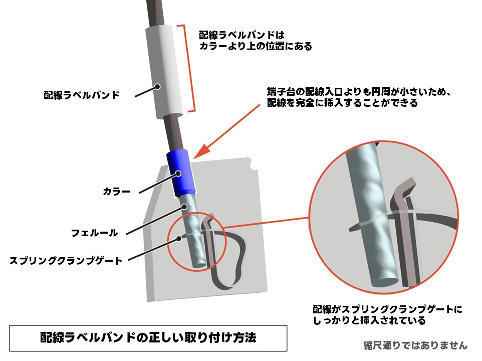 図に示されている配線ラベルバンドの取り付け位置は、正しい方法だとカラーより上の位置になっているのに対して、コンテナ船「DALI」の方はカラーの大部分を覆うように配線ラベルバンドが取りけられているため配線がスプリングゲートへ完全に挿入されていない状態。