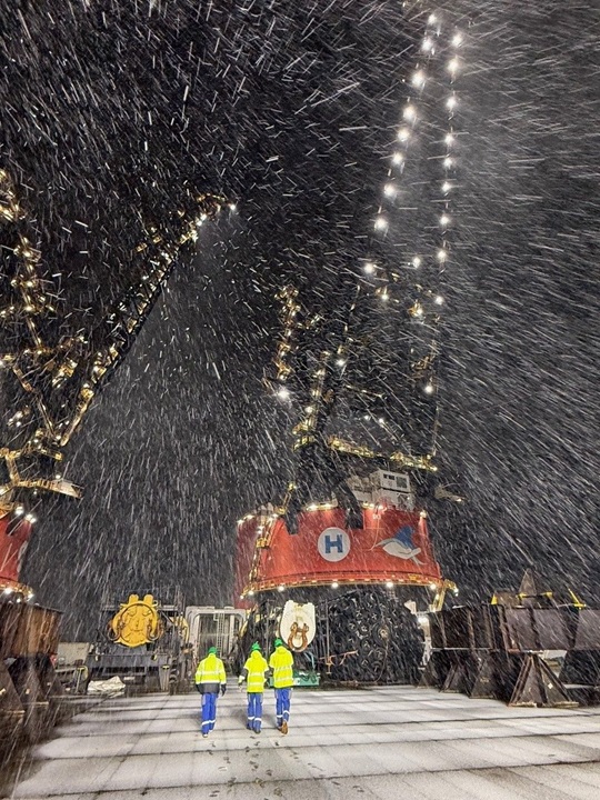Heerema Marine Contractorsの情報によると、ジャケット重量は1,950トン、トランジションピースの重量は830トン。冬季の厳しい海象条件の中、困難な気象状況の合間を縫って作業を進め、スケジュール通りに設置を完了したという。LinkedInに投稿された画像では、雪かみぞれのようなものが降る甲板上を作業関係者が歩く様子を紹介しています。見ているだけで寒そう。お疲れさまでした。