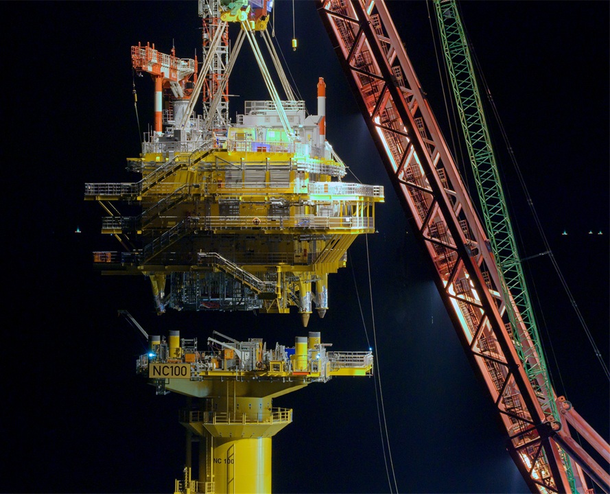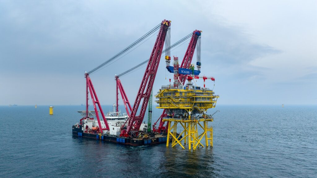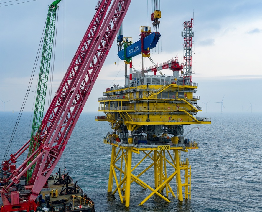 洋上変電所トップサイド2基の設置作業は、ベルギーのScaldis Salvage & Marine Contractors NVが所有する4,000トン吊り起重機船「Gulliver」により実施。
