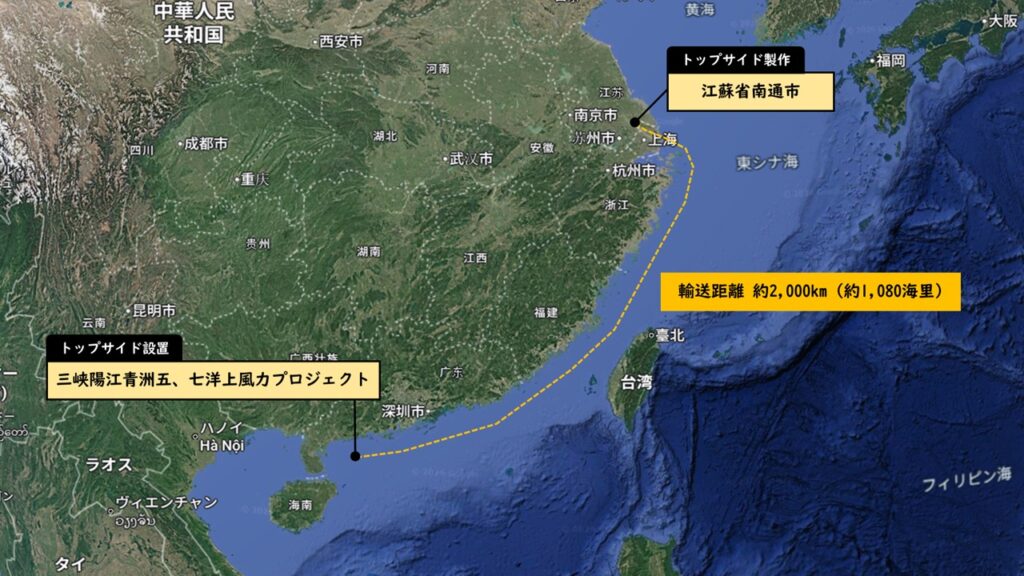 トップサイドの製作をおこなっている江蘇省南通市から広東省陽江市沖に位置する「三峡陽江青洲五、七洋上風力プロジェクト」の設置エリアまでは、約2,000km(約1,080海里)。