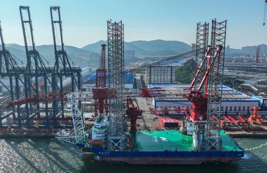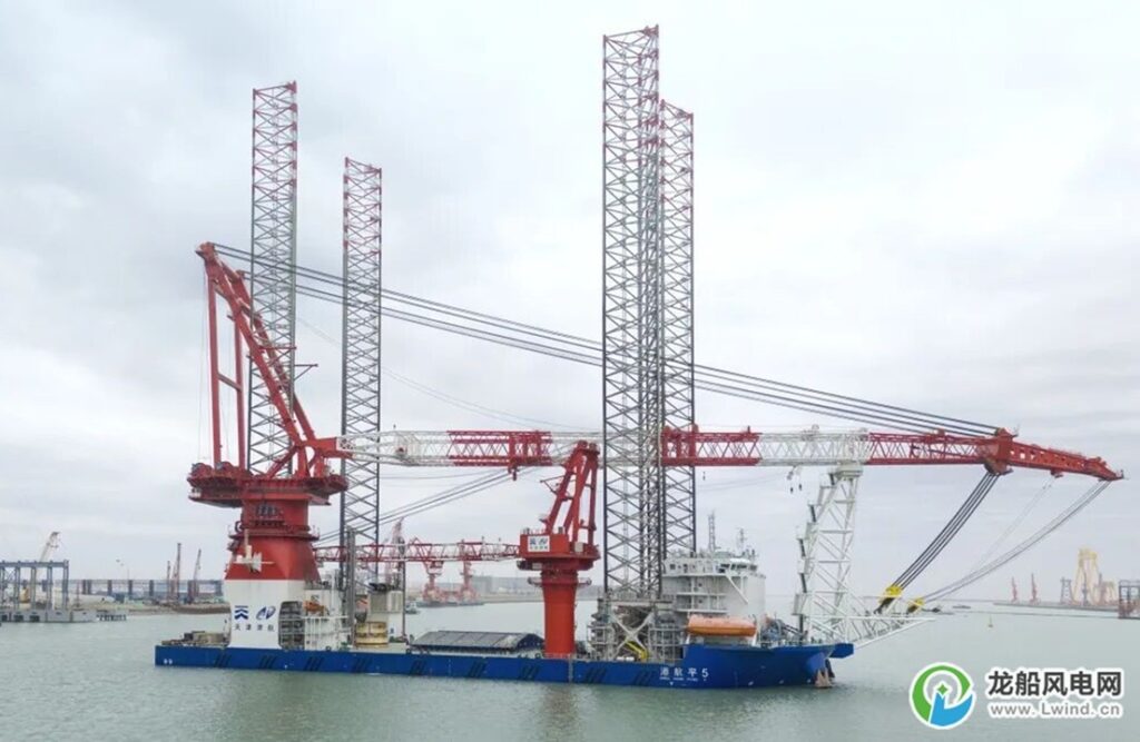 2026年4月21日、天津港航工程有限公司の1,800トン吊りSEP起重機船「港航平5」(Gang Hang Ping 5)はレグ長さを140mに延長するアップグレードを完了。