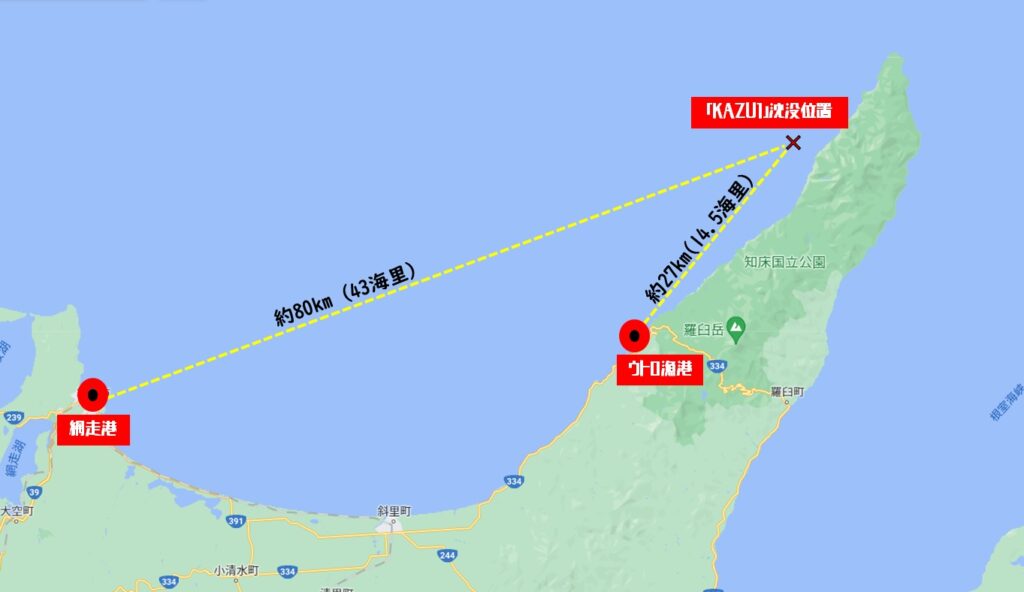 網走港と知床半島は少し距離があります。5月18日夕方に網走港を出港すると現場到着は約7時間後なので深夜ですね。