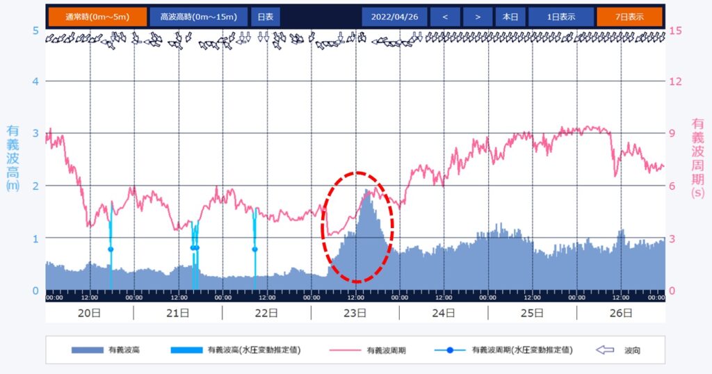 下の画像は「KAZU1」が事故を起こした日の紋別(南)の波高実績。朝は波高20㎝程度だったのが、昼過ぎのピーク時は2m近い波高に激変。数値は有義波高なので現場では3m近い波も稀にあったかもしれません。実測地点が紋別(南)で知床半島より西に位置しており数時間のタイムラグがあると思うので何とも言えませんが。
