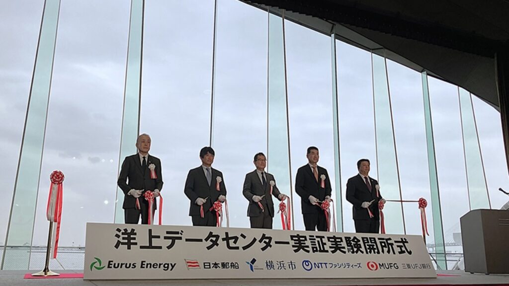 2026年3月25日、日本郵船、NTTファシリティーズ、ユーラスエナジーホールディングス、三菱UFJ銀行、横浜市は再生可能エネルギー100%で運用する洋上浮体型データセンターの実証実験を開始。