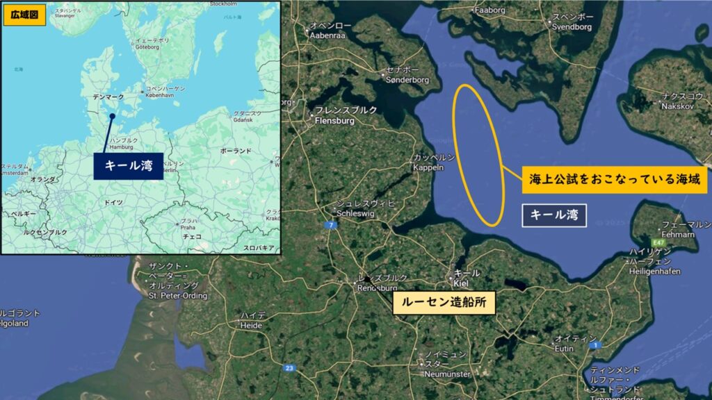 AIS情報によると、メガヨット「COSMOS」はキール運河沿いのシャハト=アウドルフにあるルーセン造船所を11月25日09時ごろ出港。キール運河を通り、キール湾に出て海上公試を実施。いつまでの予定なのか不明ですが、11月30日時点ではまだ海上公試を実施中でした。